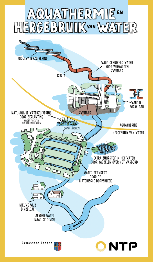Een deel van het (warme) effluent water wordt naar de technische ruimte van het zwembad gepompt. Binnen het project wordt een deel van het gezuiverde water uit de zuivering van Losser naar het zwembad gepompt. Daar wordt via warmtewisselaars een deel van de warmte uit dit water gehaald voor de verwarming van het zwembad. Het water uit het verwarmingssysteem wordt verder opgewarmd met warmtepompen naar 50°C om het gebouw en het zwembadwater te verwarmen. Voor de douches wordt een deel van het water zelfs opgewarmd tot 72°C. Het gezuiverde afvalwater stroomt vervolgens via de Bleek weer richting de Dinkel. Het systeem kan volledig gasloos draaien. Door deze verduurzaming wordt jaarlijks naar verwachting 100.000 m³ gas bespaard.
