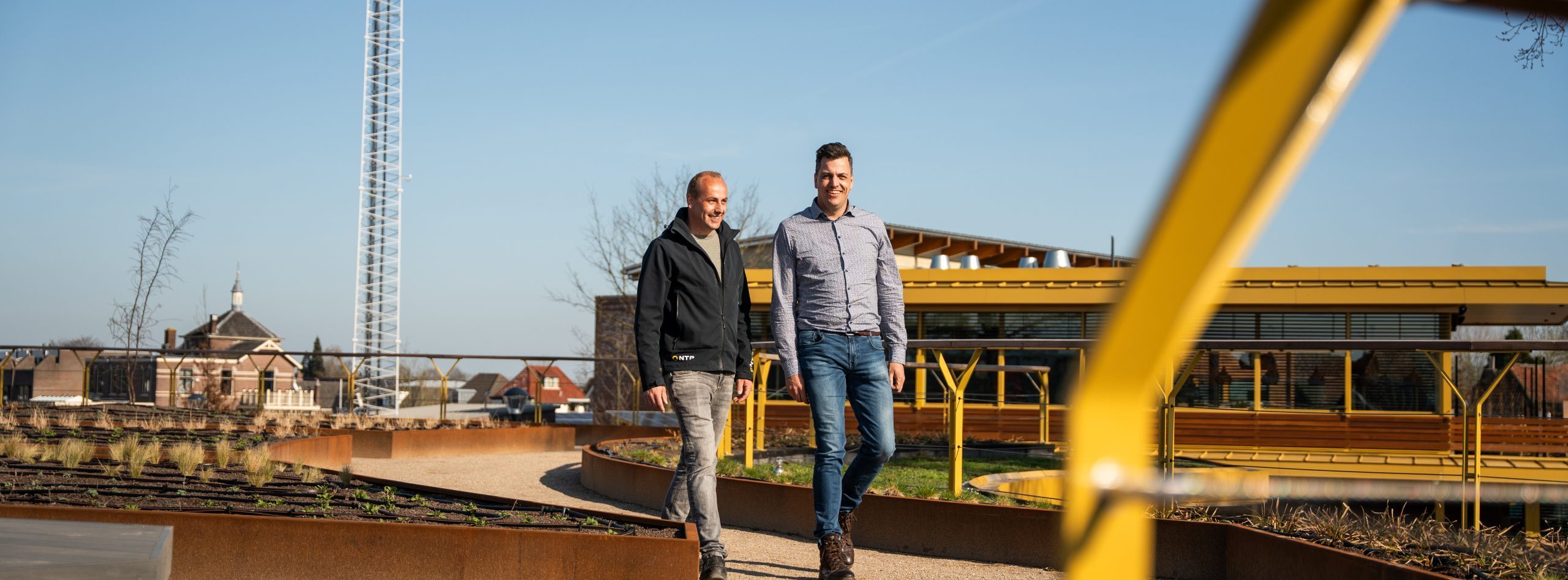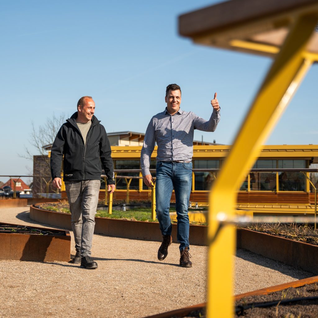 Een van de meest in het oog springende onderdelen is de daktuin op de stalling. “Het aanzicht van het werk – als je eraan komt rijden en de zon schijnt erop – dat vind ik echt mooi,” zegt Marco. Erik vult aan: “De invulling van de daktuin, in combinatie met de kleurstelling, maakt het tot één geheel.”Voor Marco was het een groot project. “Erik heeft me daarin meegenomen, waardoor we samen iets moois hebben kunnen neerzetten.” Erik haalt zijn plezier vooral uit de dynamiek: “Iedereen zit er positief in. Dat is cruciaal voor het resultaat én het proces.”
